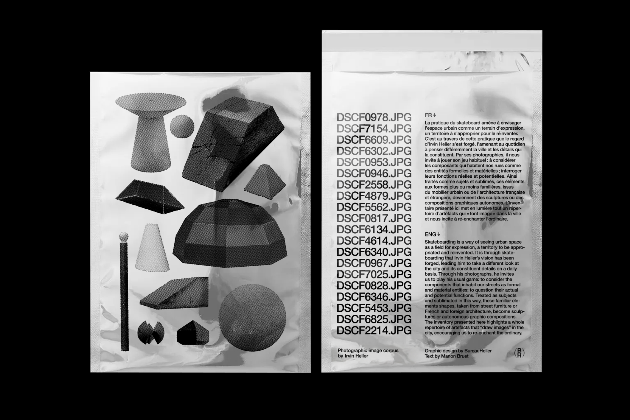 La pratique du skateboard amène à envisager l'espace urbain comme un terrain d'expression, un territoire à s'approprier pour le réinventer. C'est au travers de cette pratique que le regard d'Irvin Heller s'est forgé, l'amenant au quotidien à penser différemment la ville et les détails qui la constituent. Par ses photographies, il nous invite à jouer son jeu habituel: à considérer les composants qui habitent nos rues comme des entités formelles et matérielles; interroger leurs fonctions réelles et potentielles. Ainsi traités comme sujets et sublimés, ces éléments aux formes plus ou moins familières, issus du mobilier urbain ou de l'architecture française et étrangère, deviennent des sculptures ou des compositions graphiques autonomes. L'inventaire présenté ici met en lumière tout un répertoire d'artéfacts qui « font image » dans la ville et nous incite à ré-enchanter l'ordinaire.