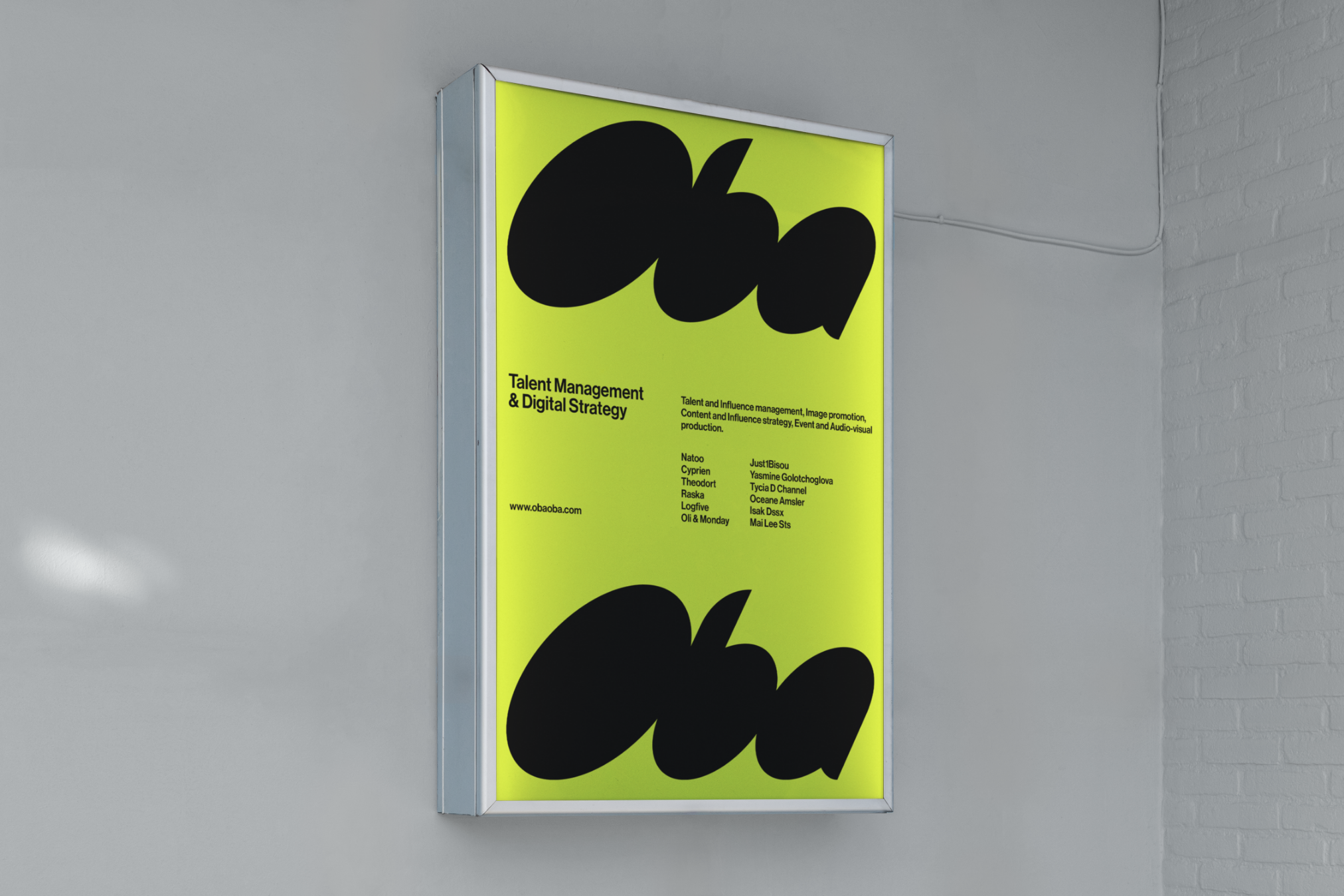 Conception de l’identité visuelle d’ObaOba, agence parisienne de production et de management de talents représentant certains des influenceurs français les plus reconnus, tels que Natoo, Cyprien ou Mehdi Maizi. L’identité visuelle repose sur une palette de couleurs vives et fluorescentes, associée à un logo inspiré de l’esthétique des années 1990 et à une typographie linéale pour les textes de labeur.