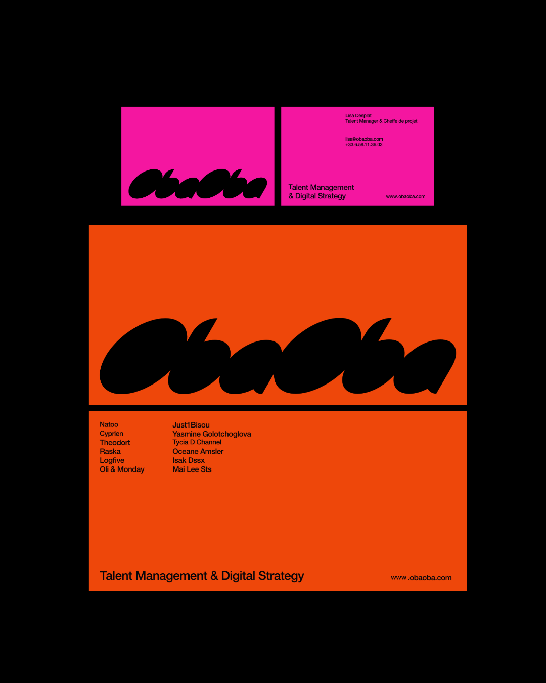 Design of the visual identity for ObaOba, a Paris-based talent management and production agency representing some of France’s most renowned influencers, including Natoo, Cyprien, and Mehdi Maizi. The visual identity is built around a vivid, fluorescent color palette, paired with a logo inspired by 1990s aesthetics and a linear typeface for body text.